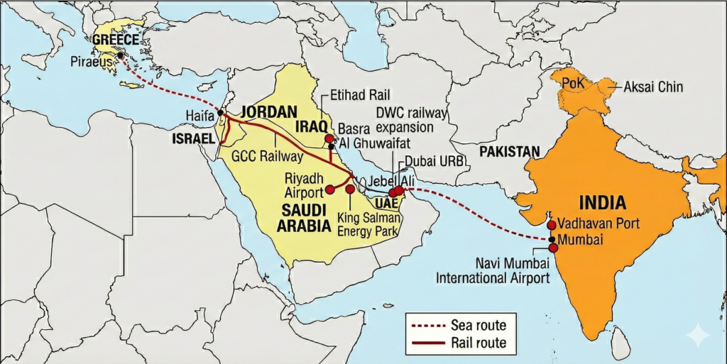 If we look at the starting point of IMEC, which is India, it has been developing the critical infrastructure on its western part, which directly contributing the perspective of IMEC on goods, services, and people. We can see the development of the Vadhavan Port in Palghar, Maharashtra, as a strategic “Mother Port”, which costs around $10 billion. Designed to rank among the world’s top 10 ports, its natural deep draft will allow it to accommodate the globe’s largest container ships, vessels that most existing Indian ports cannot currently handle. This critical infrastructure aims to serve as the primary gateway for exports bound for Europe and the Middle East, effectively acting as the maritime launchpad for future trade routes like IMEC.